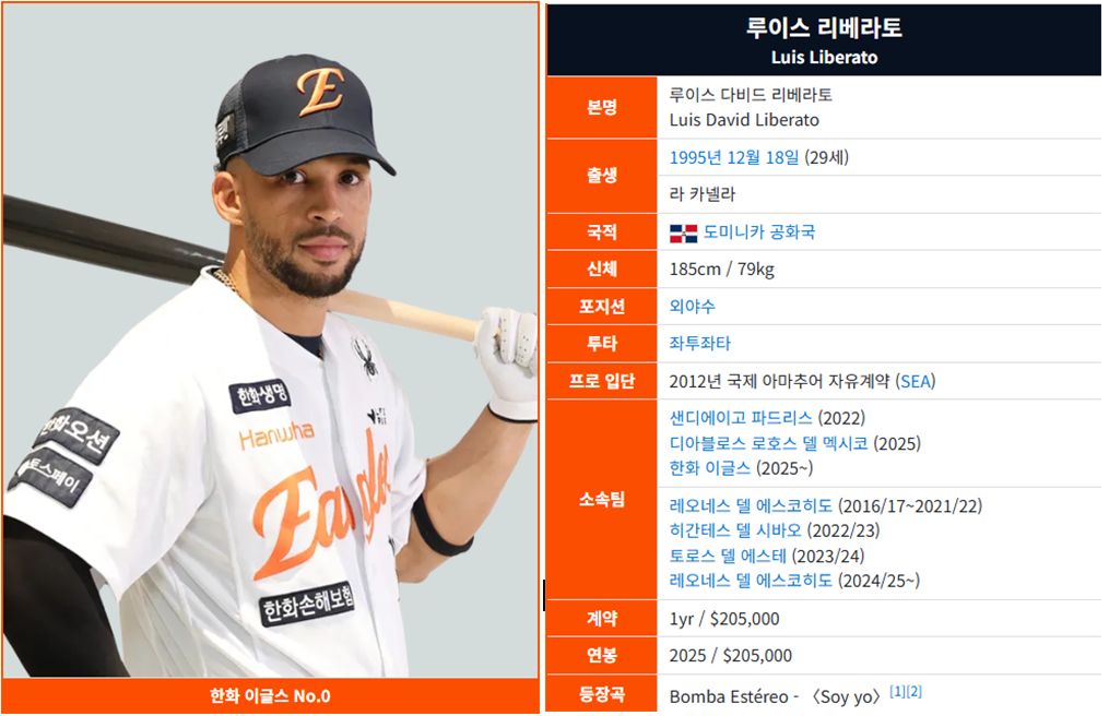 한화 0.379 맹타 결국 리베라토 선택, 플로리얼은 웨이버 공시. 리베라토 프로필