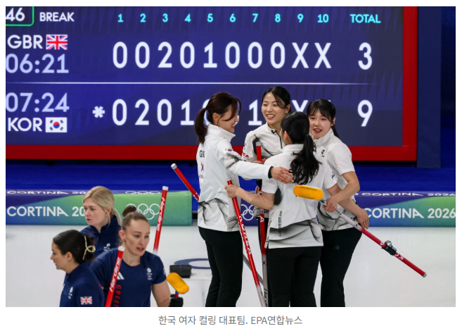 대한민국 여자 컬링 대표팀이 2026 밀라노 코르티나담페초 동계올림픽 예선에서 기분 좋은 승전보를 전했습니다. 스킵 김은지를 필두로 김민지 김수지 설예은 설예지로 구성된 한국 대표팀은 지난 13일 이탈리아 코르티나 컬링 올림픽 스타디움에서 열린 라운드로빈 3차전에서 영국을 9대 3으로 완파했습니다. 1차전 미국전 패배 이후 개최국 이탈리아와 강호 영국을 잇달아 꺾으며 1패 뒤 2연승을 기록한 한국은 2승 1패의 성적으로 미국과 함께 공동 3위에 이름을 올렸습니다.
